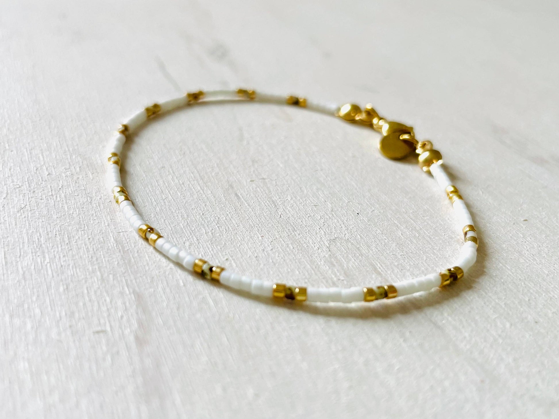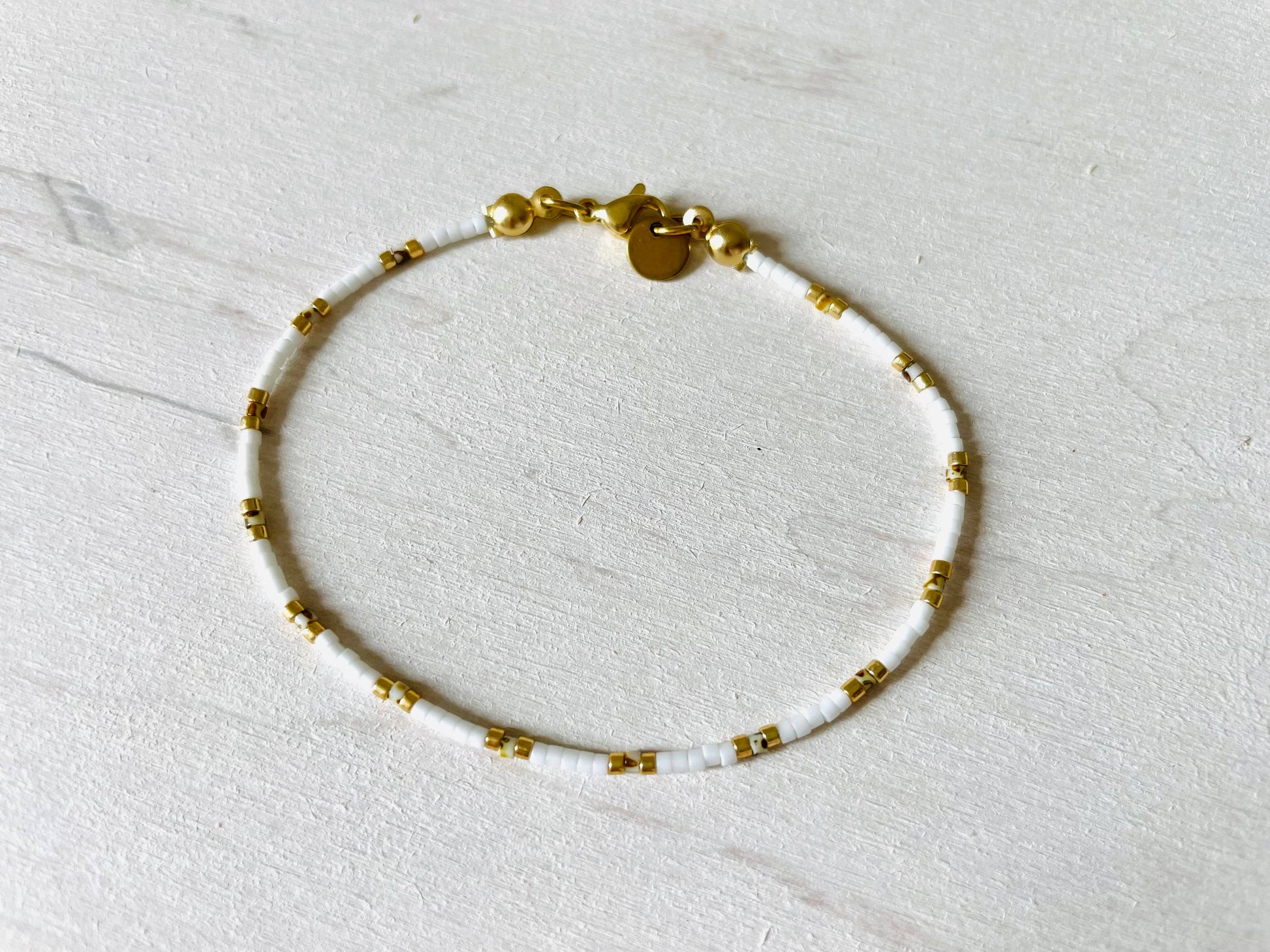 Miyuki pearl bracelet (1.6mm in diameter) made of glass, with snap hook closure and flat round stainless steel charm.