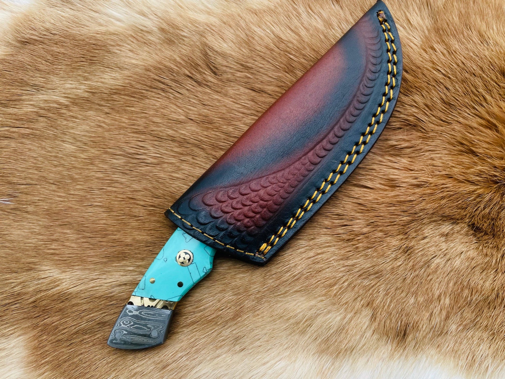 The knife features a turquoise resin grip handle, which not only provides a comfortable and secure hold but also adds a vibrant pop of color to the design.